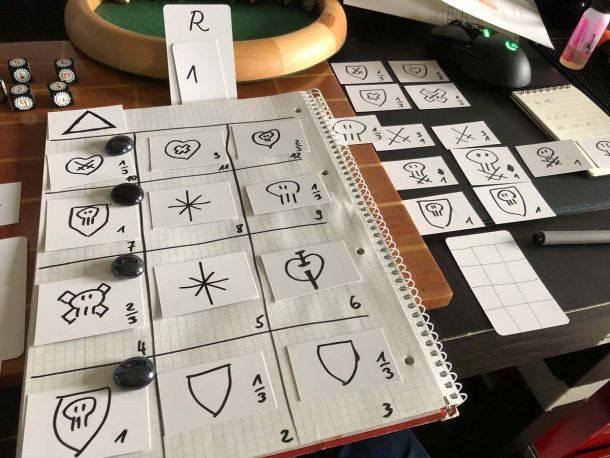 I made a big "DinA4 card" which I could stare at for hours and on which I could arrange different symbols. Each card had to be constructed according to certain rules, which are not visible to the player.