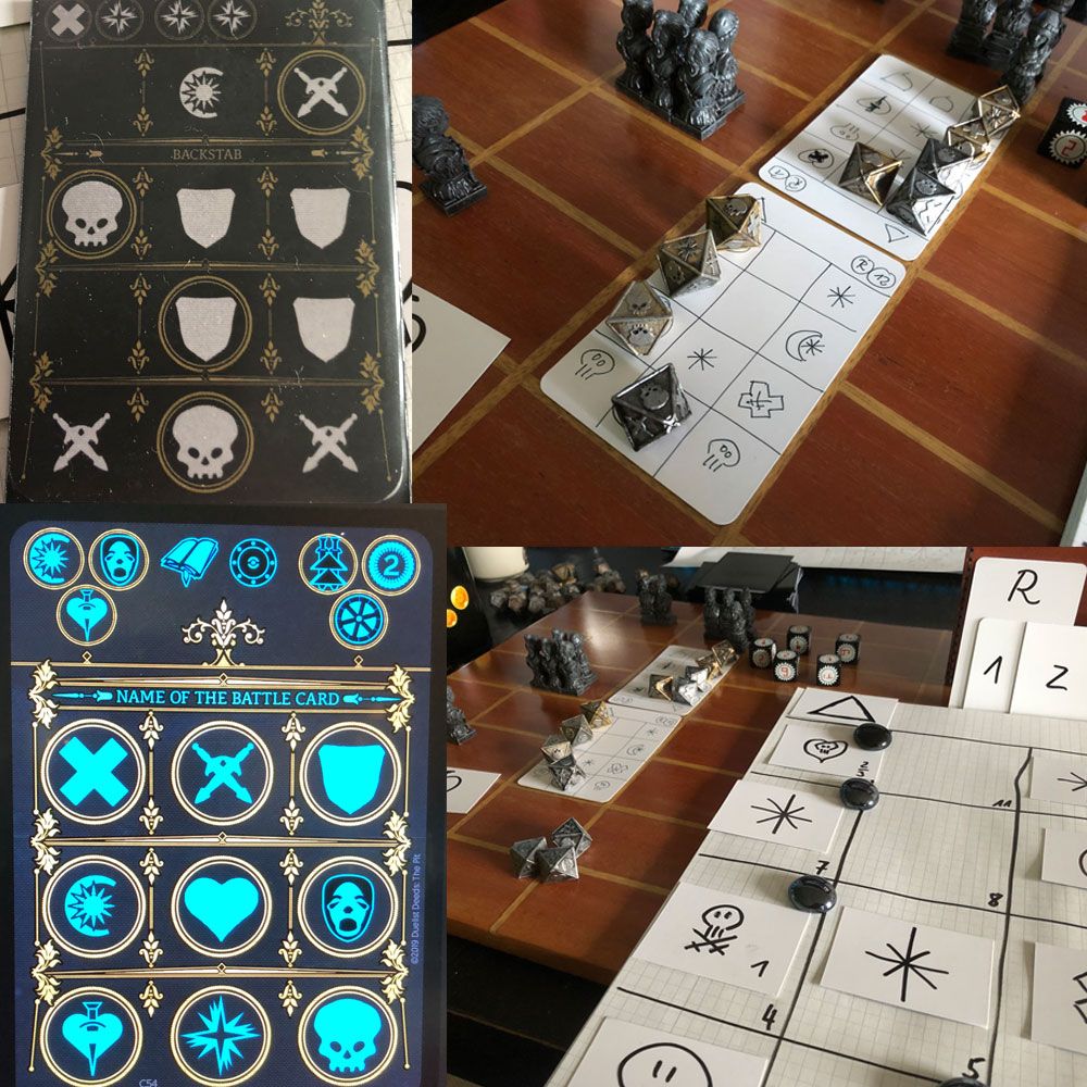 Since human- and monster characters use different dice, each card had to be playable with 12-sided and 8-sided dice. The dice not only have a different side number, but also different symbols on them.
