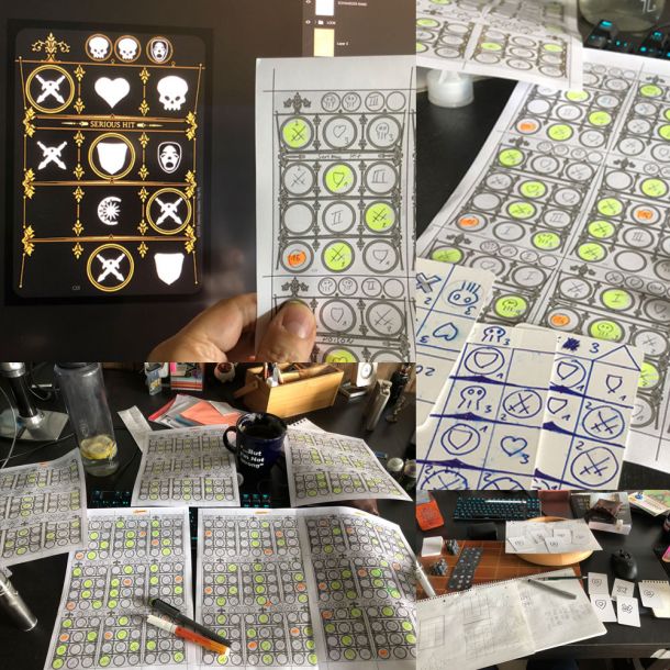 So I had to create over 30 different combinations of elements that are still visible on the cards in card sleeves in the middle of the board.