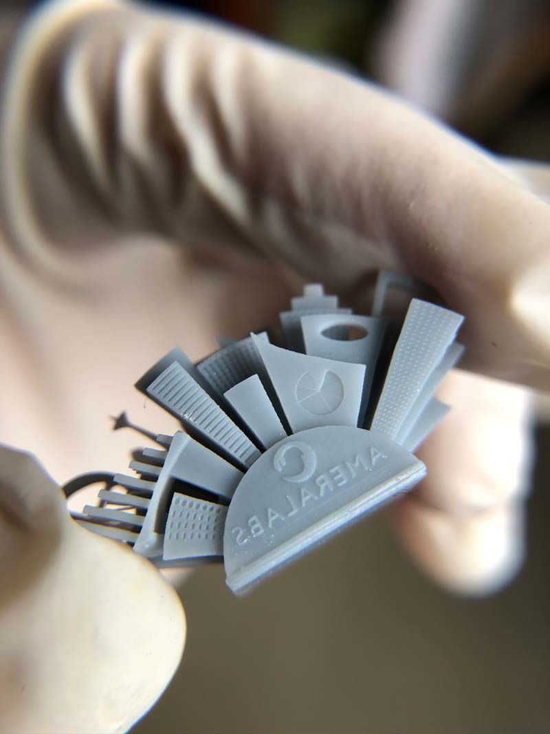 The quality is so impressive! Of course, you can only print small quantities and it takes all night, but if you look at this 2cm (!) wide test print, you can see what tiny pieces are made here. I'm shocked every time, even when I hold a magnifying glass in front of the miniature.