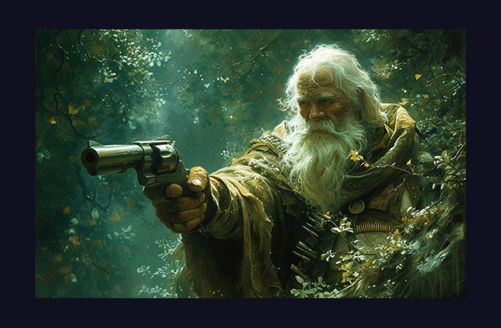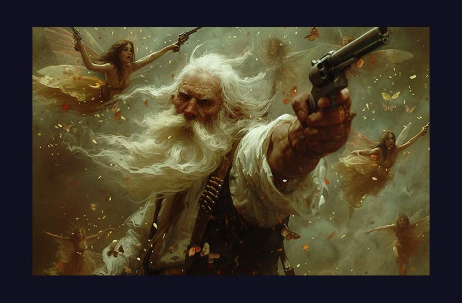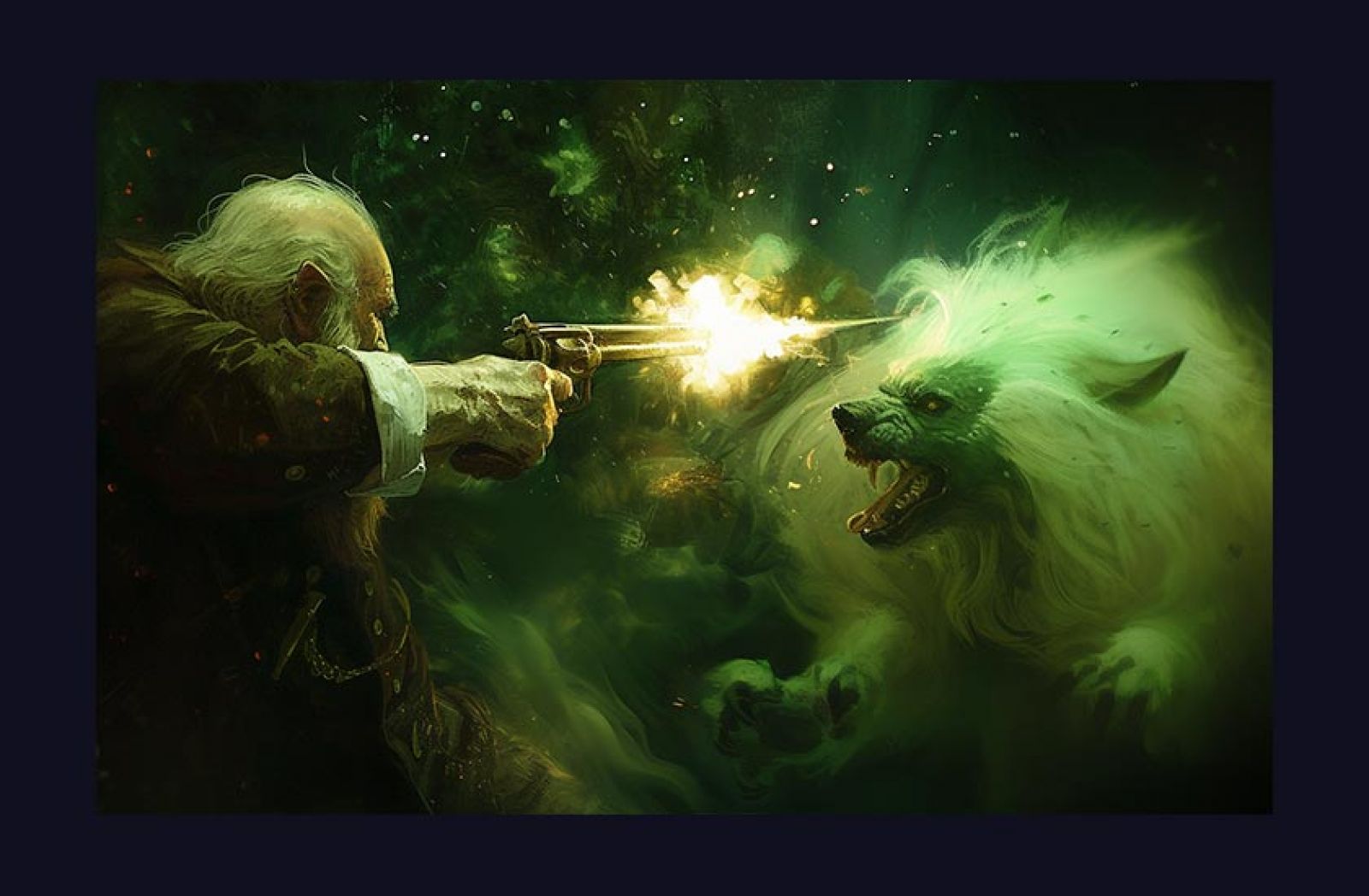 A gunslinger, whose beard also shimmered with gray and who traveled in a wagon, responded to the wanted notice, killed the monster, recovered the monster's treasure and gifted it to the peasants. He freed the fairies that the werewolf had collected out of loneliness. The humans glorified the mercenary, who gained supernatural powers from the grateful fairies. They forgot the werewolf, for they never realized that without nemesis there would be no heroes and without prejudice there would be less nemesis.