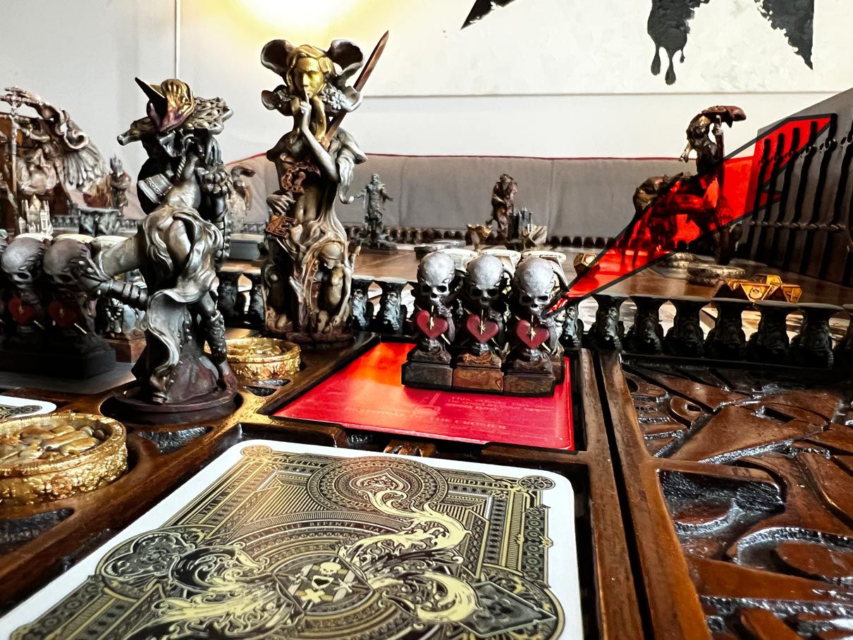 Each player controls four army boards that are positioned outside the game board. Three of them represent the monsters, one of them represents the champion. Each board is marked with a bust of the respective miniature. The army boards contain the artifacts, humans, souls, coins, level markers and mercenaries that are carried by the army of the respective monster or champion.