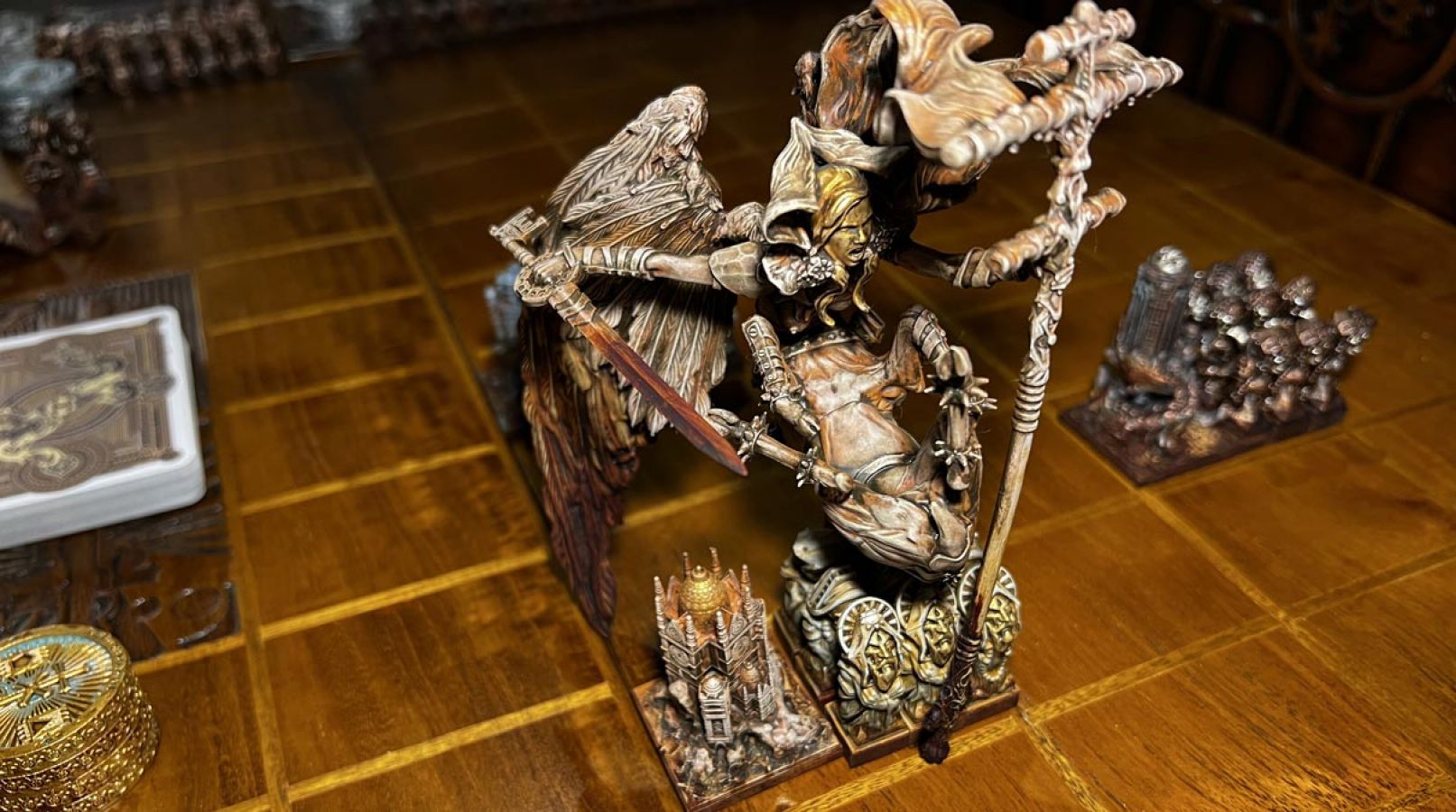 Various elements can be stored on the sides of the realm areas, such as cards, coins, temples or citadels.