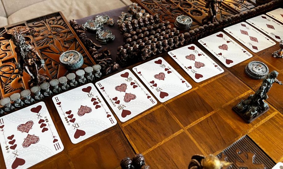 Whenever a battle takes place between the realms, it is fought with battle cards in which the opposing armies, disguised as dice, move towards each other. Whoever places the last die in the last row wins the battle. The battle is decided by skill and tactics and only partly by luck.