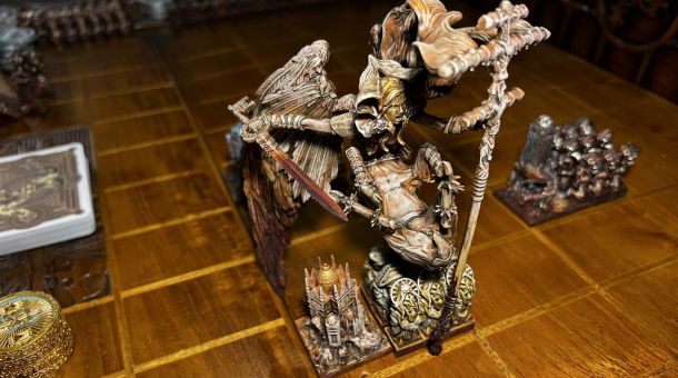 Before the game, each player chooses a side. Angel or demon. Each player chooses 3 out of 8 angels or 8 demons. In addition, each player chooses one of 8 champions. These monsters and champions are the only ones who can take part in the game. There are monsters with three different levels of strength. Small, medium and large. A player can choose any monster of his realm he wants up to a maximum of 3 monsters. A player can choose to play with three small monsters if they so choose (playtesting still in progress). Each choice has its own strategic advantages and disadvantages.