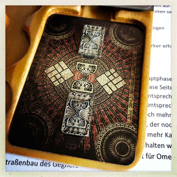 The solution as shown in the picture below: The location card that is placed on the playing field has no text left. The text is moved to two identical cards which are put into a sleeve together with the location. If the location is turned over, each player gets one of the text cards. This not only ensures that the game board remains "clean" and free of text, but also gives the player the opportunity to have the text on the locations in front of him at all times, to discover things that his opponent might miss.
