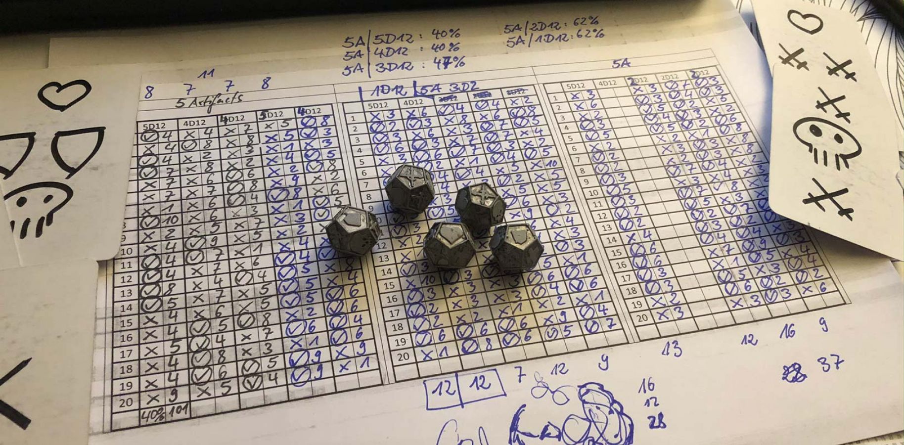 The chance is between 30 and 70 %. The player now "digs" through the deck and finds cards with different symbols on them. When he has found all the symbols he rolled on the drawn cards, the next artifact belongs to him. He can also continue digging to find another Artifact or a Might-marker to upgrade a monster. But be careful! If you draw the wrong card, the digging turns into a world of pain!