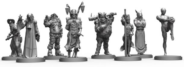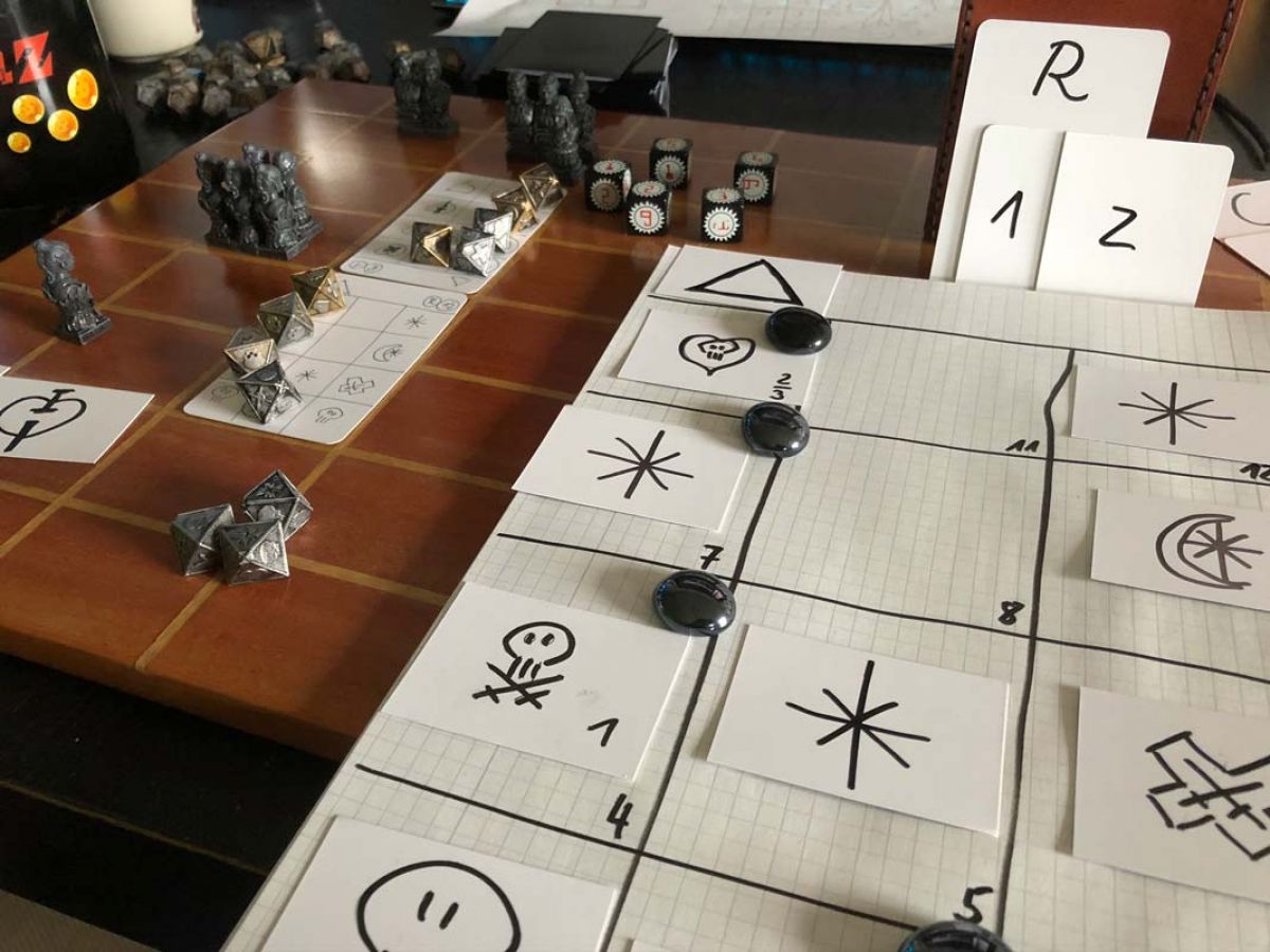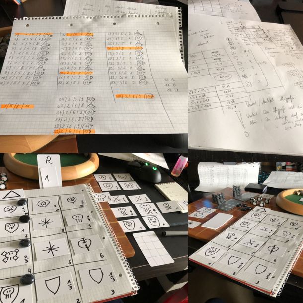 Since human- and monster characters use different dice, each card had to be playable with 12-sided and 8-sided dice. The dice not only have a different side number, but also different symbols on them.