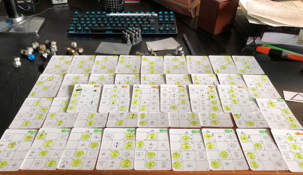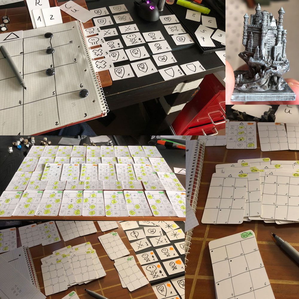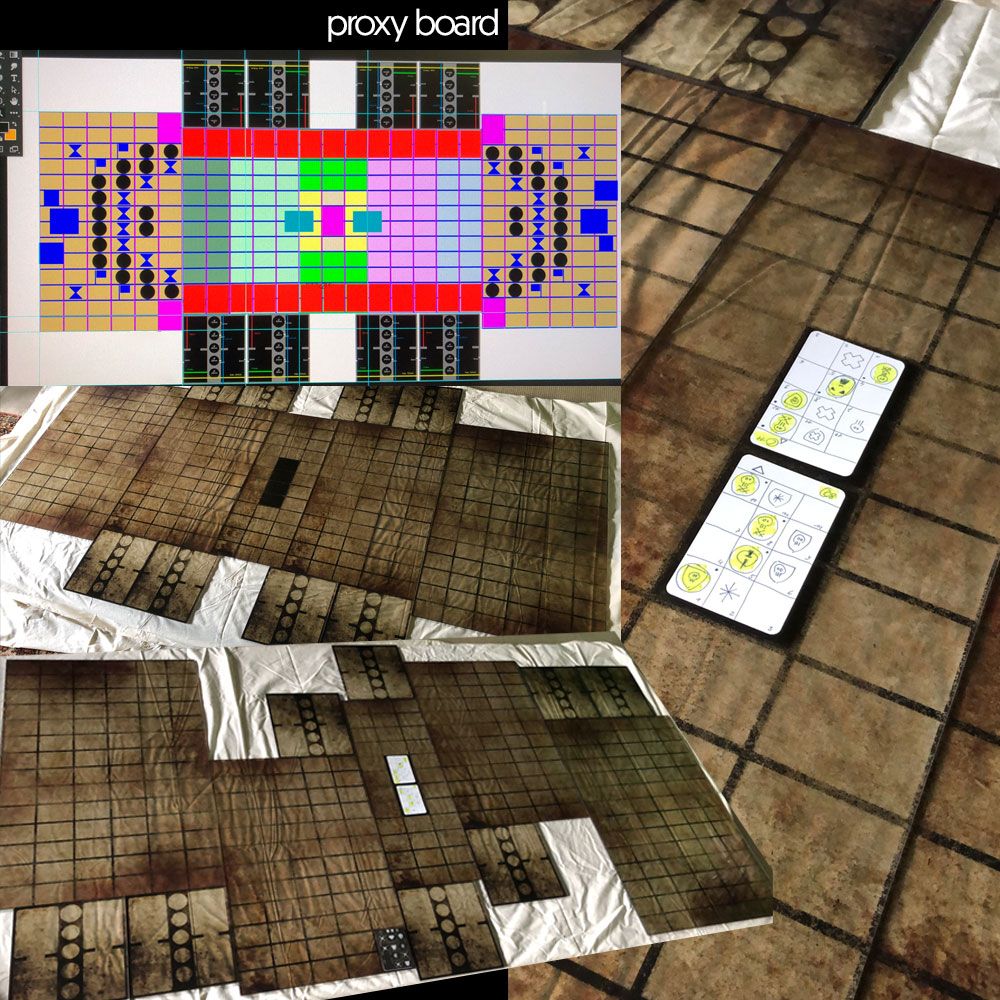 So I had to create over 30 different combinations of elements that are still visible on the cards in card sleeves in the middle of the board.