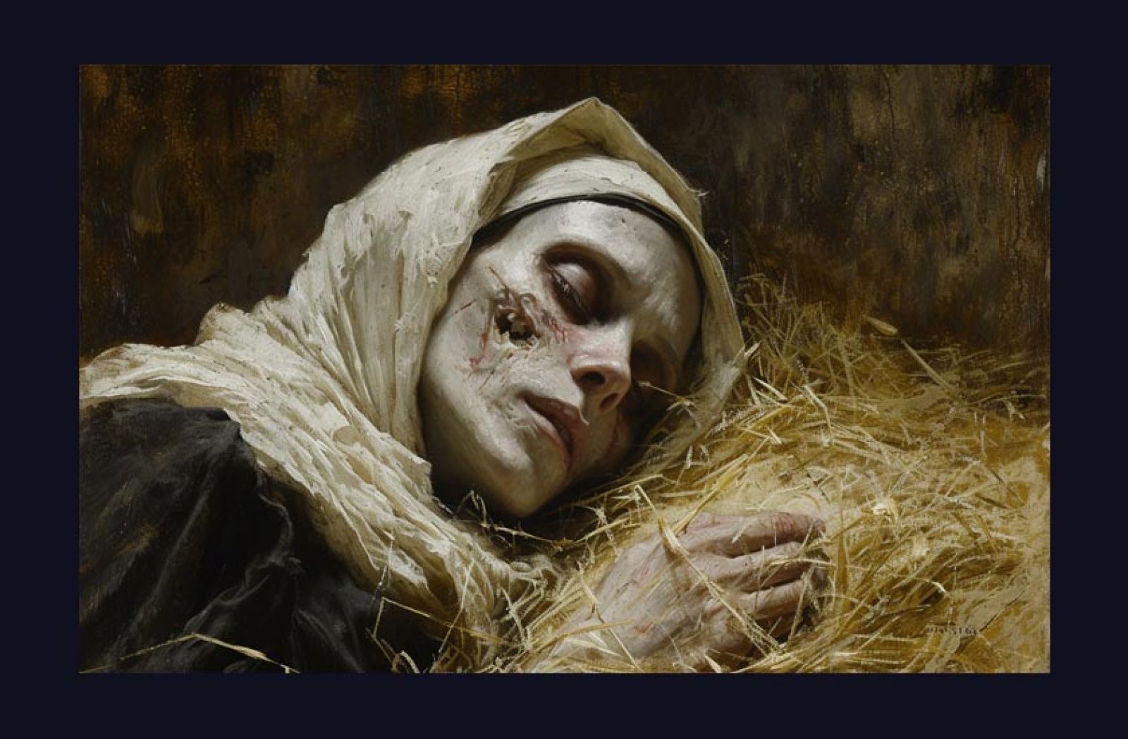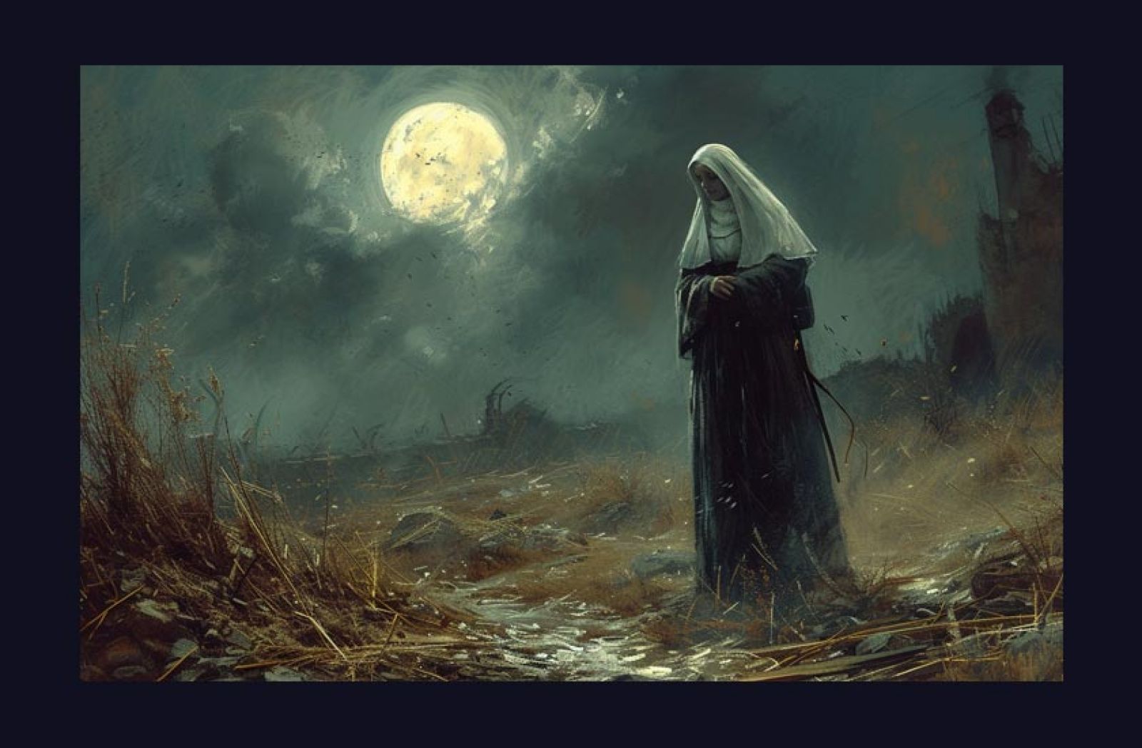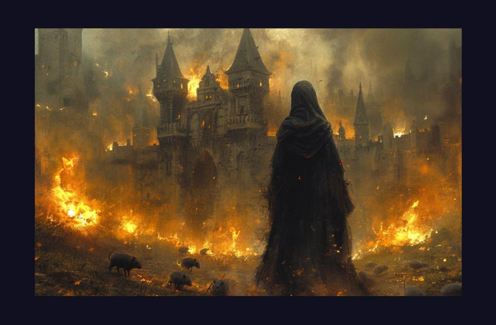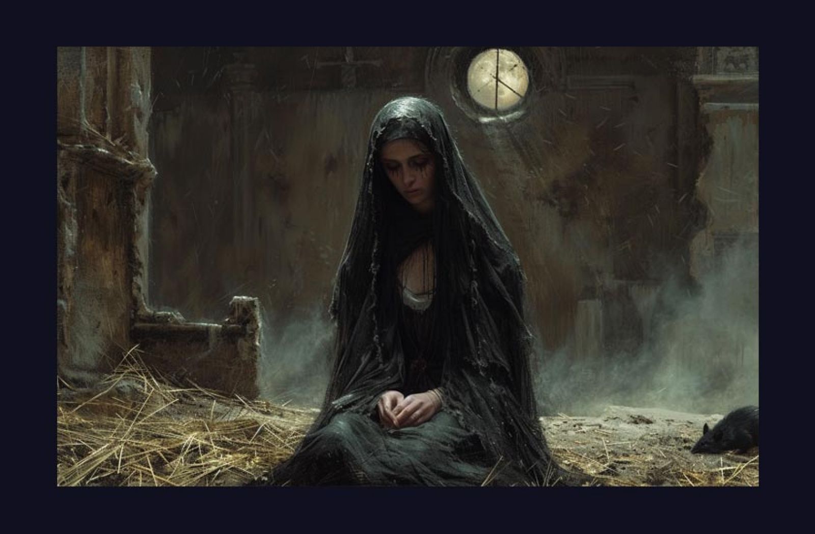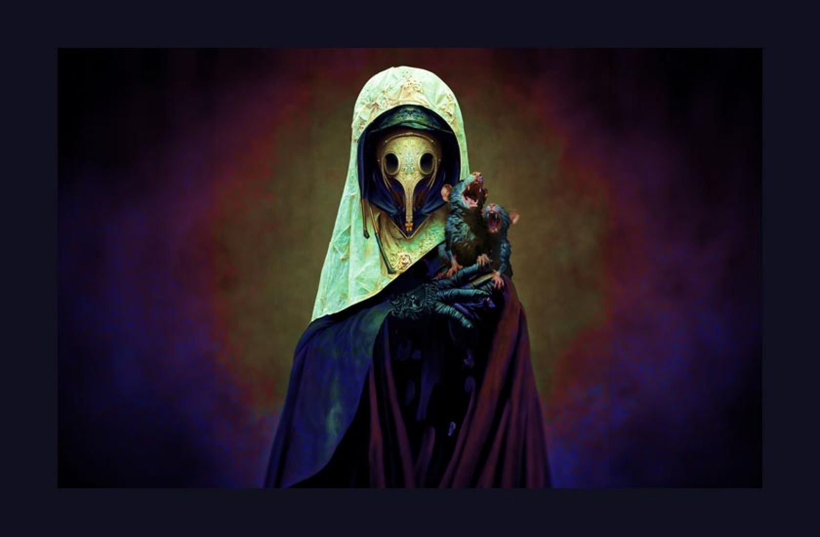 When an institution that pretends to care about the salvation of people's souls considers the suffering of its believers' bodies a punishment from God and therefore ignores them, forbidding even those who have compassion to act compassionately; when knights rot in their armor supported by steel and are pierced by the black death instead of steel, when castles rot and the benevolent have only the rats in their dungeons with whom they can talk, whisper, make plans, then it is time for a revolution: evolution. A body immune to disease that nurtures illness like flowers in a garden: to ravage humanity, to burn down the forest so that something new can emerge from the ashes. A charitable woman, whose charity has turned its back on humanity, now cares for rats who carry the plague into the world of the living, who whisper secrets to her and encourage her that the suffering will soon come to an end. A believer who does not believe in God, does not believe in science. She only believes in progress through death.
